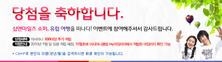 | 아시아나클럽 샵앤마일즈 100마일 추가 적립 이벤트 당첨자 발표 공통 2010.10.4 14:26 | ||||||||||||||||||||||||||||||||||||||||||||||||||||||||||||||||||||||||