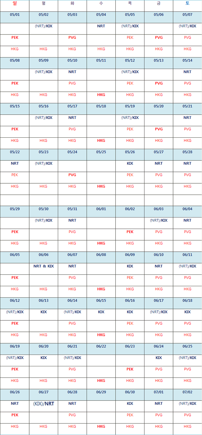 l  일본(NRT/KIX)출발 편은 위와 같이 기간별 운항일정 변동이 많으므로 유의하여 주시기 바랍니다. l  (NRT)/KIX = NRT-KIX-AKL 통합운항 일정이므로 편의를 위하여 KIX-AKL로 예약 바랍니다. è  통합 운항일은 향후 변동이 없으므로, 우선 예약하시기 바랍니다. l  (KIX)/NRT = KIX-NRT-AKL의 여정으로 6/27만 해당되오니 NRT-AKL로 예약 바랍니다. l  NRT & KIX = NRT-AKL 와 KIX-AKL 각각 운항하는 날입니다. 그러나 변동 있을 수 있습니다. è  따라서 일본(NRT/KIX) 경유 일정은 위의 통합운항 날짜로 예약하시기 바랍니다.   l  중국의 HKG은 Daily 운항하며 PVG은 주3회(화, 금, 토) 및 |