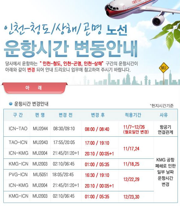 | [동방항공] 청도,상해,곤명 운항 스케쥴 변경 안내 공통 2011.11.8 11:39 |