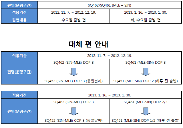 싱가폴항공을 이용하시는 고객 여러분께 안내말씀 드립니다.싱가폴-말레 구간 SQ462/461 편이 2012년 11월 7일 ~ 12월 19일, 2013년 1월 16일 ~ 1월 30일까지 일시 감편 됩니다.