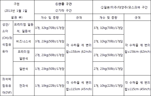 중국남방항공을 이용하시는 고객 여러분께 안내말씀 드립니다2013년 1월 1일부터 발권하는 모든 항공권에 개수제(piece concept)규정을 적용합니다승객의 여정과 탑승 좌석 등급에 따라 적용되는 무게 및 개수가 상이하니 아래 내용을 참고하여 주시기 바랍니다.