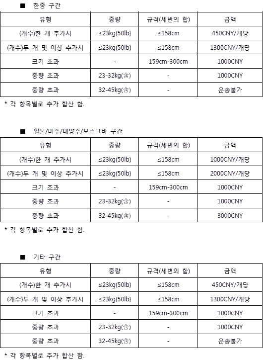 1. 각 노선별 수화물 규정